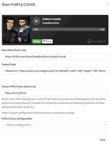 You can also select a store configuration to send people to, using the Direct HTML5 Store Share Link. This will send customers to your full store with the chosen beat playing at the top of the list.