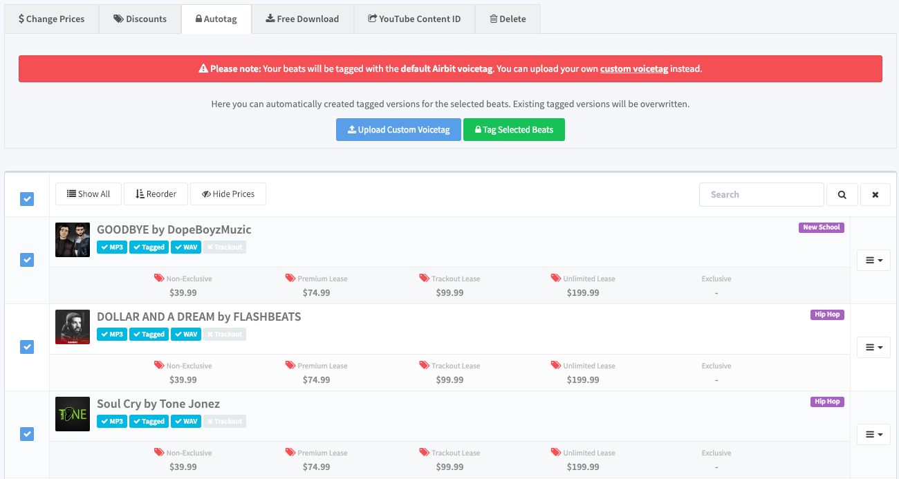 After saving the new beat, a tagged version will automatically be generated for your beat. Autotag will automatically tag your beats with the Airbit voicetag. You also have the option to use your custom voicetag (more information below on uploading a custom voicetag).